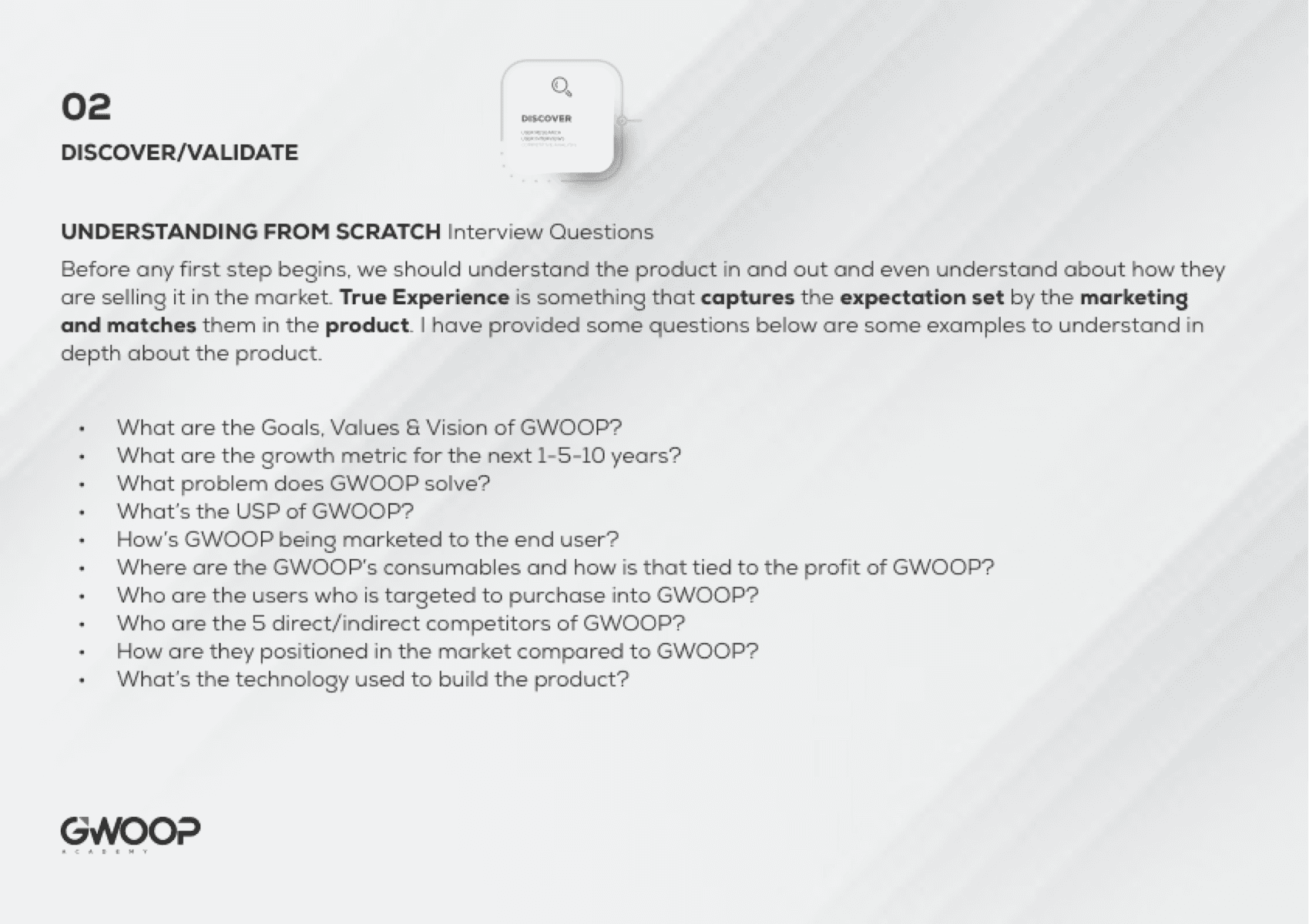 Before any first step begins, we should understand the product in and out and even understand about how they are selling it in the market. True Experience is something that captures the expectation set by the marketing and matches them in the product. I have provided some questions below are some examples to understand in depth about the product. • What are the Goals, Values & Vision of GWOOP? • What are the growth metric for the next 1-5-10 years? • What problem does GWOOP solve? • What’s the USP of GWOOP? • How’s GWOOP being marketed to the end user? • Where are the GWOOP’s consumables and how is that tied to the profit of GWOOP? • Who are the users who is targeted to purchase into GWOOP? • Who are the 5 direct/indirect competitors of GWOOP? • How are they positioned in the market compared to GWOOP? • What’s the technology used to build the product?